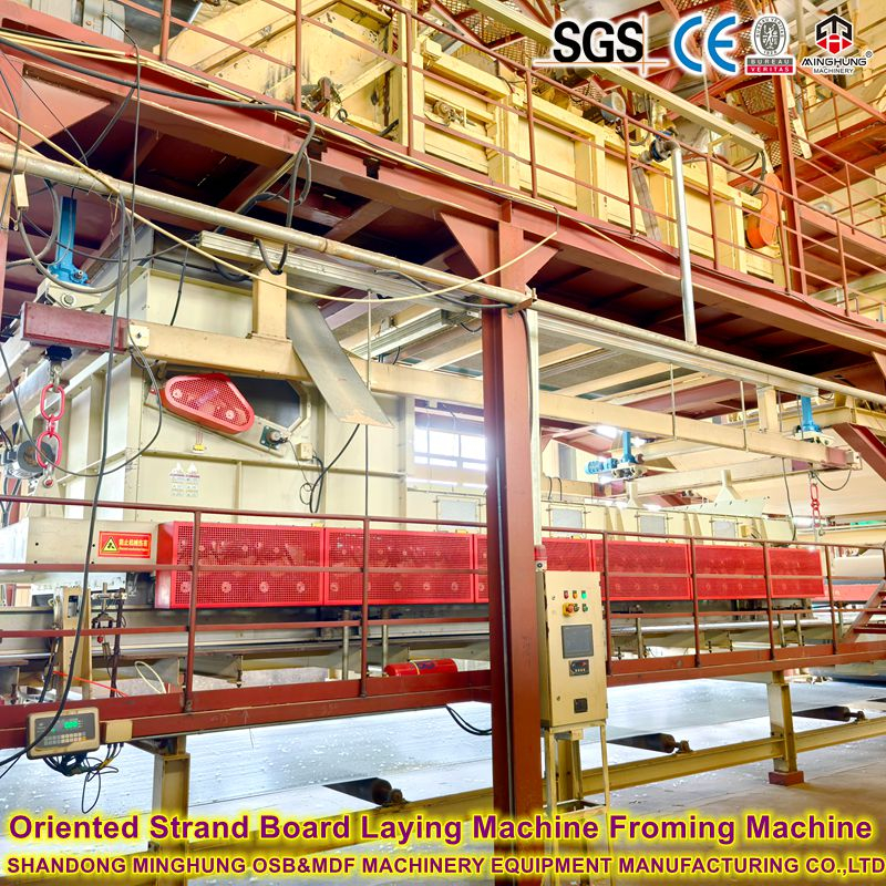 Stasiun Pembentukan Berorientasi Mekanik: Peralatan tanda tangan dari jalur OSB. Ini memanfaatkan serangkaian rotasi pada kecepatan spread mekanis kecepatan konstan untuk berorientasi dan menyebarkan untaian wajah di sepanjang arah garis produksi (arah panjang panel), sedangkan untaian inti disebarkan secara acak. Dengan tepat mengendalikan kecepatan dan arah kepala yang menyebar, ia menciptakan tikar yang seragam, berlapis-lapis dengan struktur berorientasi, yang merupakan sumber sifat kekuatan anisotropik dari panel OSB.